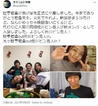 さらに「代わりに大阪の同期佐川ピン芸人が新メンバーとして入居しました。よろしく佐川ピン芸人!蛙亭岩倉out佐川ピン芸人in。えっ蛙亭岩倉out佐川ピン芸人in?」と、イワクラにかわってお笑い芸人の佐川ピン芸人が入居したことも明かした。