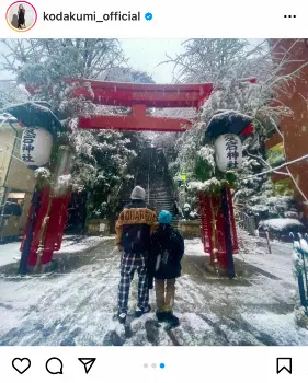 「昨日は東京はすごい雪でしたー。東京の神様にご挨拶行けてなかったので行こうってなってて、まさかの大雪で!!!京都の城南宮行った時は快晴でした!」とつづり、参拝最中の夫と息子の後ろ姿をアップした。