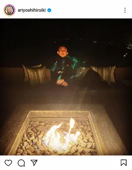 屋外デッキに置かれたベンチに座る有吉を写したものだが、囲炉裏越しに写真を撮ったことから、まるで緑と黒の服を着ているように。有吉も「炎をまとう」とつづった。