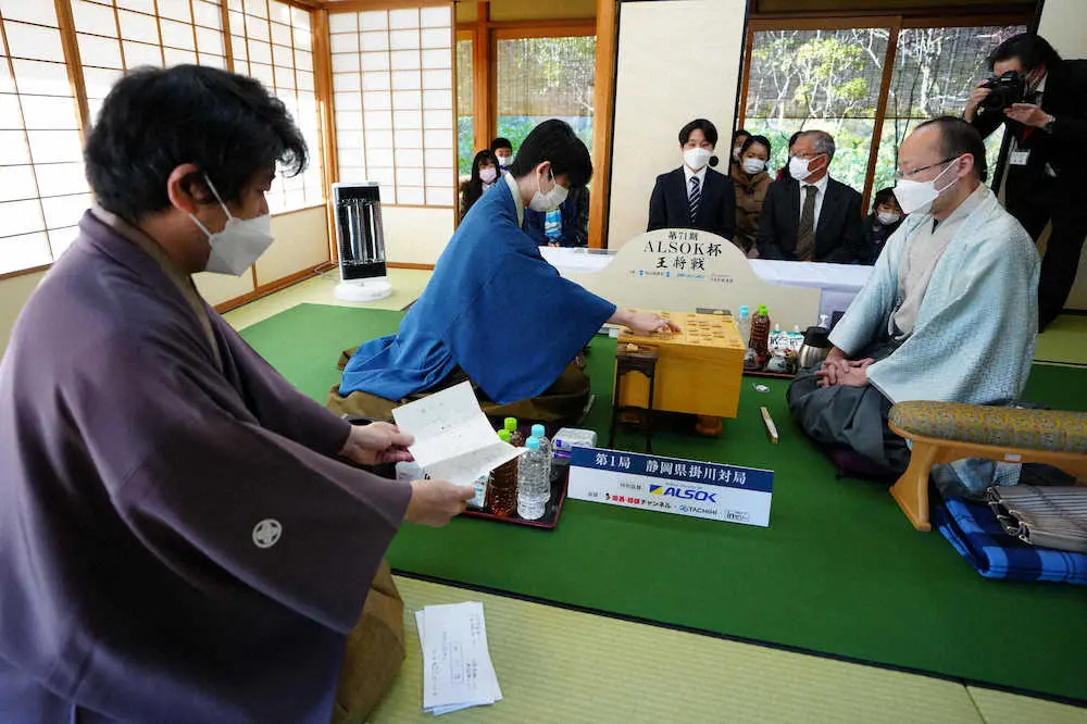 <王将戦第1局第2日>対局再開時間となり一礼する渡辺王将(右)と藤井竜王 Photo by スポニチ 藤井竜王の封じ手は「3五歩」 王将戦第1局対局再開 ギャラリーで見る この記事のフォト 2022年01月10日の画像一覧 もっと見る 2022年01月10日の画像をもっと見る