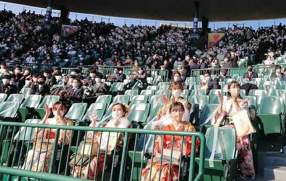 西宮市の成人式「二十歳を祝うつどい」が成人の日の10日、同市内の阪神甲子園球場で行われた。甲子園球場では2020年の初開催から3年連続。新型コロナウイルスの感染対策を施し、約30分と簡素化して行われた。本年度20歳を迎えた3945人が参加した。
