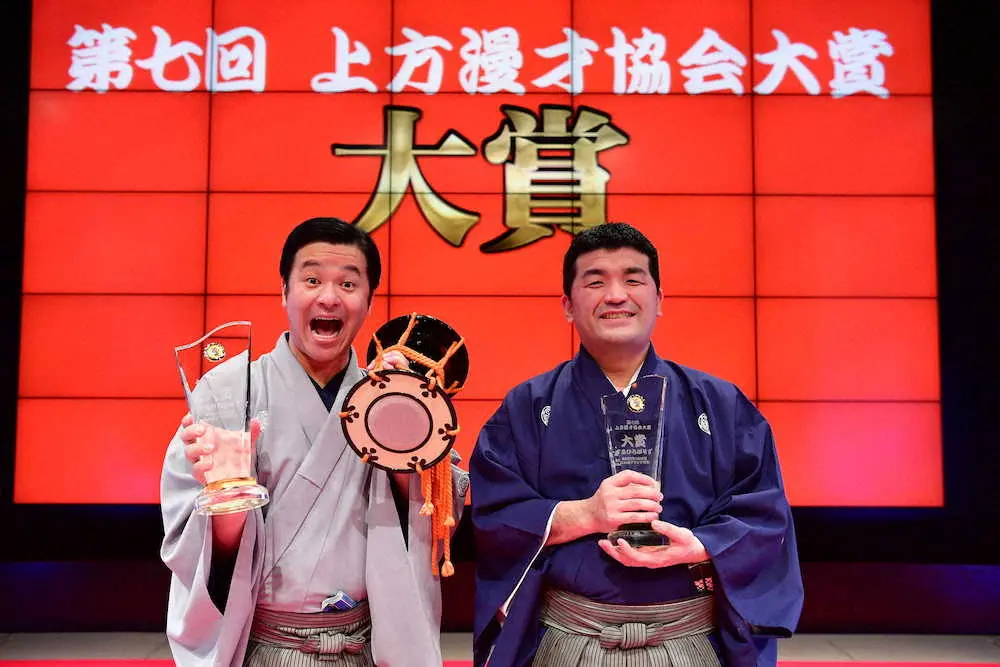 「第7回上方漫才協会大賞」が10日、大阪・ミナミのなんばグランド花月(NGK)で発表され、すゑひろがりずが大賞に輝いた。ボケ担当の三島達矢(39)は「今回なければないかなと思ってました」と感激の面持ち。ツッコミで小鼓担当の南條庄助(39)は受賞の瞬間、驚いて小鼓を鳴らすのを忘れ「やりました」と涙声。さらに「まだまだ自分たちの漫才は固まってない。もう一段階研究して、固めたい」と漫才に対して貪欲なところを見せていた。
