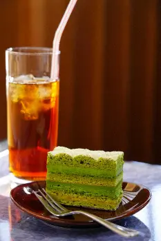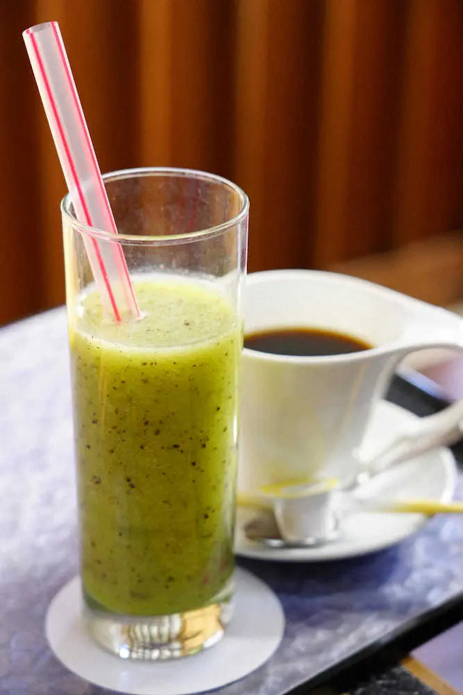 王将戦第1局2日目午前おやつ 渡辺王将はキウイジュース、藤井竜王は茶畑イメージの「お茶のケーキ」