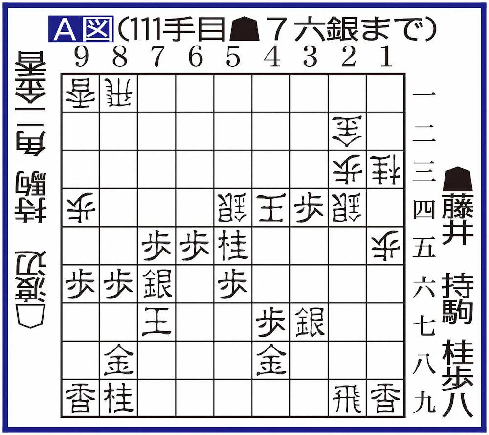 長いねじり合いが続いた午後、藤井が▲2二歩と際どいタイミングで渡辺陣に切り込むと返す刀で渡辺も△8八歩~3七歩成と藤井陣を崩しにかかる。残り時間が互いにすり減っていくが両者ギリギリでバランスを保つ。そして差は広がることなく秒読みへ突入。極限状態の中、▲7六銀(A図)が勝負将棋を象徴する一手。自陣の憂いをなくし続いて▲5七桂~4六銀と盤上の中央に駒を集結させスクラム完成だ。▲3六桂など攻め手が見える中、「負けない形」を選択した藤井。延々と続く福田三段の秒読みの声が対局室に響く中、藤井が力ずくで渡辺王を押しつぶした。(スポニチ本紙観戦記者)