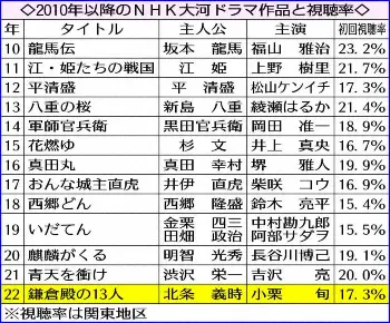 これまでの大河では、戦国時代をテーマにした作品が高視聴率となる傾向にあったが、同局関係者は「多様な視聴形態が選択肢にある中、鎌倉というなじみない時代で高い数字となった」と手応え。「今後、回を重ねるごとに視聴率が伸びる可能性も十分にある」と指摘している。