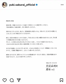 また桜井は自身のインスタグラムを更新し、「わたくし桜井は、俳優の黒羽麻璃央さんと結婚しました事をご報告させていただきます」と報告。「いつも皆様の温かな応援に支えられ役者として活動させて頂ける事、本当に感謝しています。そして更に成長していけるように、しっかり地に足をつけ邁進していきたいと思いますので、これからも桜井ユキをよろしくお願い致します」と記し、最後には「自分がこんな文章をアップする日が来るとは思いませんでした。むずむずするので今日は自転車で爆走します」とした。