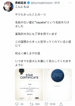 そしてきょう自身のツイッターを更新した黒崎は「やりたかったことの一つ。名前のない星に“sayaka”という名前を付けました」と星に名前をつけて大切な人に贈ることができるサービスを使って、星に沙也加さんの名前を付けたことを報告。「事務所の方にも了承を得ています。この座標からきっと見守ってくれていると信じて。明るく輝くさやの星。いつまでも皆さんを優しく照らしてくれますように」とつづり、「私の永遠」と書かれた登録証を添えた。
