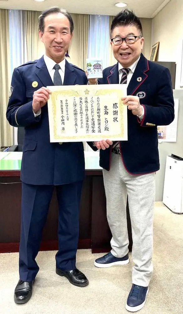 生島は「高齢者の方の交通事故のニュースを目にするたびに、心が痛みます。これからも、高齢者の方の交通安全に対する啓蒙活動を積極的に行います」と宣言。小山内勇同署署長から感謝状を贈られ、気持ちを新たにしていた。