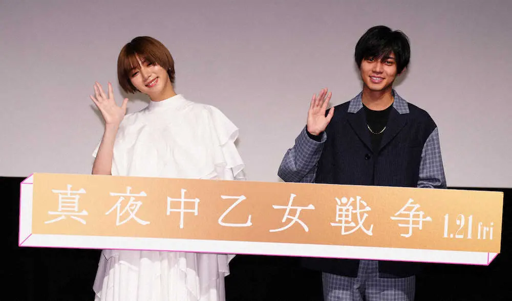 King&Prince永瀬廉(22)が14日、都内で映画「真夜中乙女戦争」(監督二宮健、21日公開)の「大学生お悩み相談イベント」に女優の池田エライザ(25)とともにサプライズで登場した。