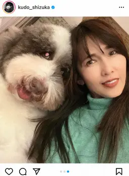 「笑 エト帽子」と工藤の頭の上に愛犬のエトワール君が顔を乗せてカメラ目線で上目遣いの姿を披露。また「3枚目はエトくん笑ってるの」と笑顔の2ショットも投稿。2枚目は工藤の肩に顔を乗せて休んでいる姿の写真を投稿している。