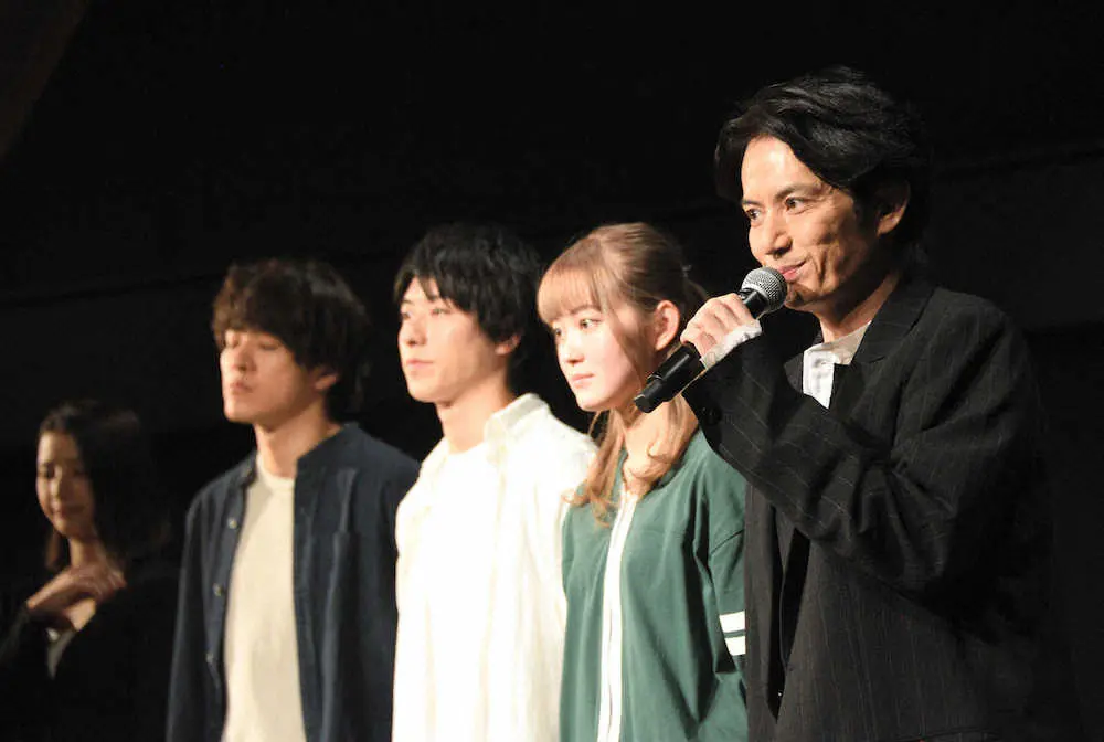 舞台「告白」でオリジナル作品の演出に初挑戦した佐藤アツヒロ(右端)と、出演したキャスト陣(左から)綺咲愛里、松島庄汰、谷佳樹、吉本実憂