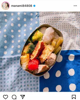 メニューについては「ツナマヨおにぎり、卵焼き、鶏肉のハンバーグ、ブロッコリーのおかか和え、大学芋(最近の大好物)、ミニトマト、パンケーキ(ご飯は気分で食べないのでご飯食べなかった時の抑え)」と紹介した。