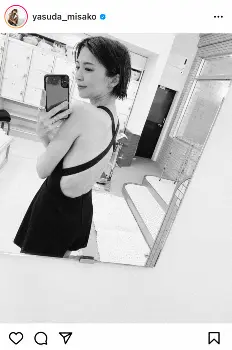 番組の告知とともに「この水着のせなかがかわゆい」とつづり、鏡越しのモノクロショットを1枚アップ。安田は、背中が大きく開いたデザインの水着を着用しており、やさしくほほえんでいる。