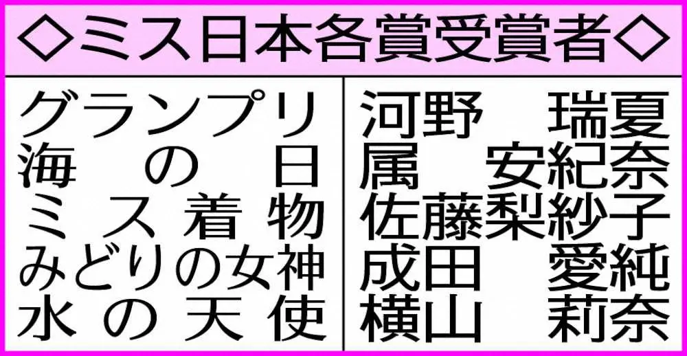 歴代ミス日本グランプリ受賞者 Photo by スポニチ ミス日本グランプリは河野瑞夏さん ありのまま…摂食障害の姿公表、希望の… ギャラリーで見る この記事のフォト 2022年01月25日の画像一覧 もっと見る 2022年01月25日の画像をもっと見る