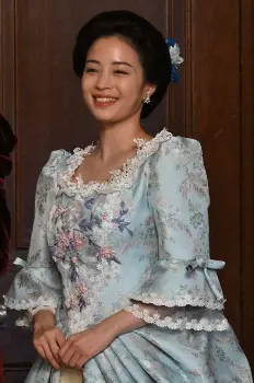 主人公の津田梅(のちの梅子)を演じる広瀬は、1883年に完成したばかりの鹿鳴館での舞踏会に参加するシーンで着用。「ドラマや映画でしか見たことのない世界観だったので、貴重な経験」と喜んでいる。