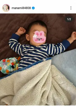 この日は「息子のテレビ問題の続き」と書き出すと、顔をスタンプで隠した息子が眠っている写真をアップ。「テレビに布をかけてないものとしていたのですが、一歳半は知恵もついてきておかしいと気づき始め、、wやはりテレビを完全禁止にするのは難しかったので朝夜30分と決めてみせるようにしてます」と明かした。