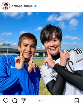 お笑いコンビ「ぺこぱ」のシュウペイ(34)が28日までに自身のインスタグラムを更新し、サッカー元日本代表で今季から関東リーグ1部、南葛SCに加入した稲本潤一(42)との2ショットを投稿した。