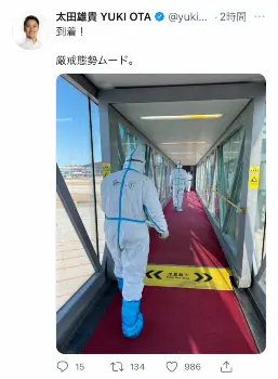 「到着!厳戒態勢ムード」とつづり、防護服を着た職員に先導され、厳戒態勢の中で入国したことを報告。その後「到着後すぐに、ADカード(アクレディテーションカード)※オリンピック期間中のパスポート代わりを使えるように手続き。その後、PCR検査(喉と鼻)鼻は、過去最高に一番奥まで刺して頂く体験をしました。その後待機室にて結果待ちの模様」と現状を説明した。