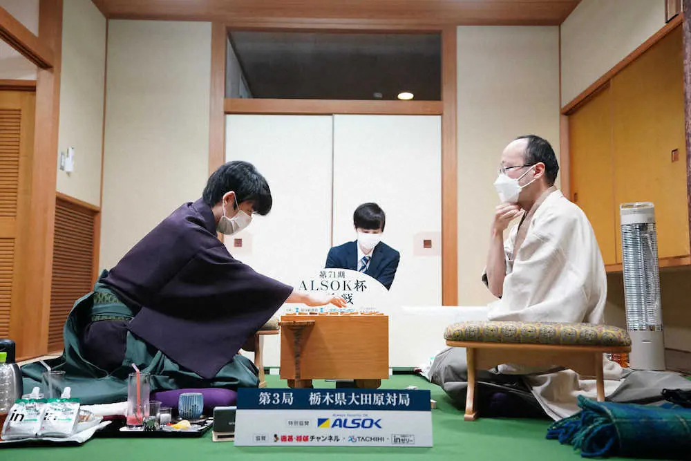 将棋の第71期ALSOK杯王将戦7番勝負(スポーツニッポン新聞社ほか主催)第3局は29、30の両日、栃木県大田原市の「ホテル花月」で指され、挑戦者の藤井聡太竜王(19=王位、叡王、棋聖の4冠)が渡辺明王将(37=名人、棋王の3冠)に135手で勝利し、シリーズ3連勝を挙げた。史上4人目の5冠獲得へ、大きな前進を遂げた。
