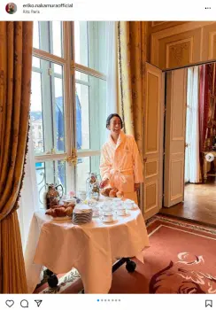 自身のブランドの撮影で「ある日、スタジオ“我が家”を抜け出し、1898年創業、ヴァンドーム広場にあるHotel Ritzへ。ホテルで一番大きな部屋で私物コーディネート ファッション撮影をさせて頂きました!」とつづり、「柔らかいピンク色のバスローブにフカフカのスリッパを履いて、ヘアメイクスタート!!」とバスローブ姿で窓辺にたたずむ様子を投稿した。
