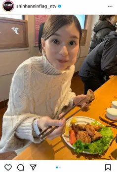 「オフショ公開!!本日はこちら」とつづり、芳根が口いっぱいに唐揚げを頬張るショットをアップ。ハッシュタグには「#お芝居で食べられなかった#すみれさん特製唐揚げ#こっそりつまみ食い#かわよ#この後ご飯と味噌汁追加で#もはや定食だった件」と添えた。