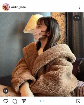 矢田は「毎日の不織布マスク。赤い紐がお気に入り!」とつづり、マックスマーラのモコモコジャケット姿に赤いひもがキュートなマスクを着けた写真を投稿した。