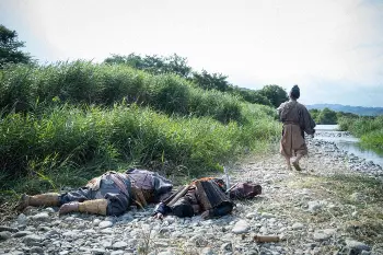 大河ドラマ「鎌倉殿の13人」第5話。善児(梶原善)に背後から襲われる宗時(片岡愛之助・手前)(C)NHK