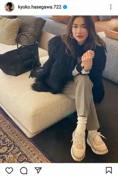 長谷川はファーの黒アウターにリラックス感のあるパンツを合わせ、ベージュ系のメッシュのスニーカーを履いてソファに腰掛ける姿を披露。柔らかい表情でカメラに視線を送っていて、「息子が撮ってくれた1枚。センスが良いと思う。あ、親バカですね」と長男のセンスを絶賛。スニーカーについては「クロエが出した環境負荷の少ない素材を厳選した、サステナビリティなスニーカー コーディネートにスニーカーを取り入れる事がそんなに得意ではありませんが、これだったらお洒落を楽しめそう」と説明した。