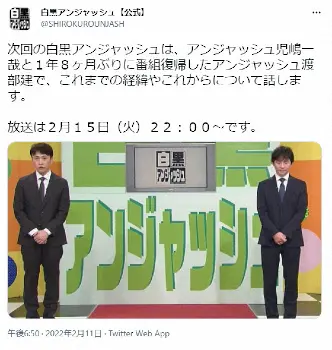 公式ツイッターでは「次回の白黒アンジャッシュは、アンジャッシュ児嶋一哉と1年8ヶ月ぶりに番組復帰したアンジャッシュ渡部建で、これまでの経緯やこれからについて話します」と記載した。