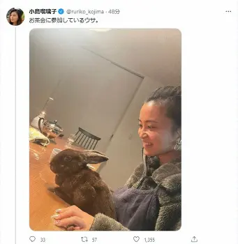小島は「お茶会に参加しているウサ」と大人しく机に乗る飼っているウサギと写る2ショット写真を投稿した。さらに「オフにすっぴんのるり」とオフですっぴん姿であることも続けてツイートした。