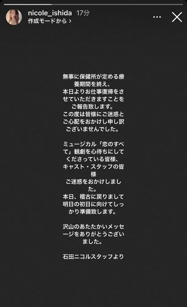 石田ニコル Photo by スポニチ 石田ニコル 2度目の新型コロナ感染から復帰 仕事再開 出演舞台「明日の… ギャラリーで見る この記事のフォト 2022年02月12日の画像一覧 もっと見る 2022年02月12日の画像をもっと見る