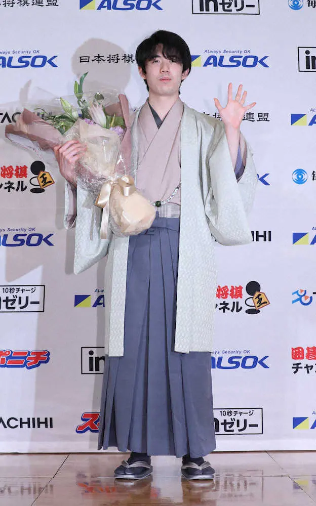 <第71期ALSOK杯王将戦第4局>史上最年少で5冠に輝いた藤井新王将が「5」のポーズをする(撮影・大塚 徹) Photo by スポニチ 藤井聡太竜王 最年少5冠にも謙虚「まだまだ見合った実力がない」 8冠達… ギャラリーで見る この記事のフォト 2022年02月12日の画像一覧 もっと見る 2022年02月12日の画像をもっと見る