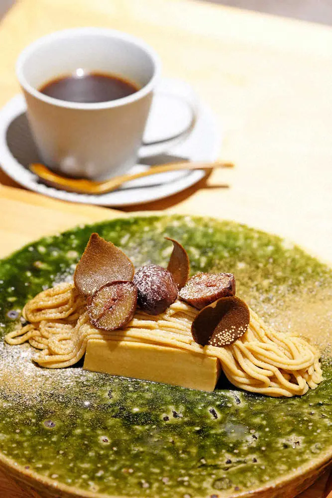 <王将戦第4局第2日>渡辺王将の午前おやつ。和栗とマダガスカル産バニラのモンブランプリンとフェアトレードコーヒー(撮影・西尾 大助、会津 智海)