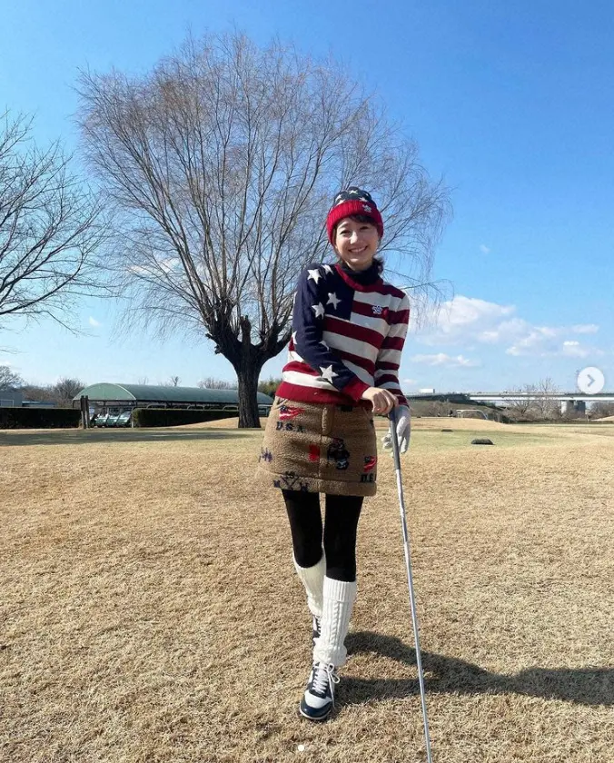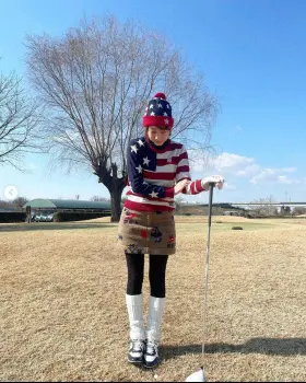 「プライベートゴルフ スコアは…秘密 笑」とつづり、星条旗のデザインのニット帽とトップス、ミニスカート姿の写真をアップした。