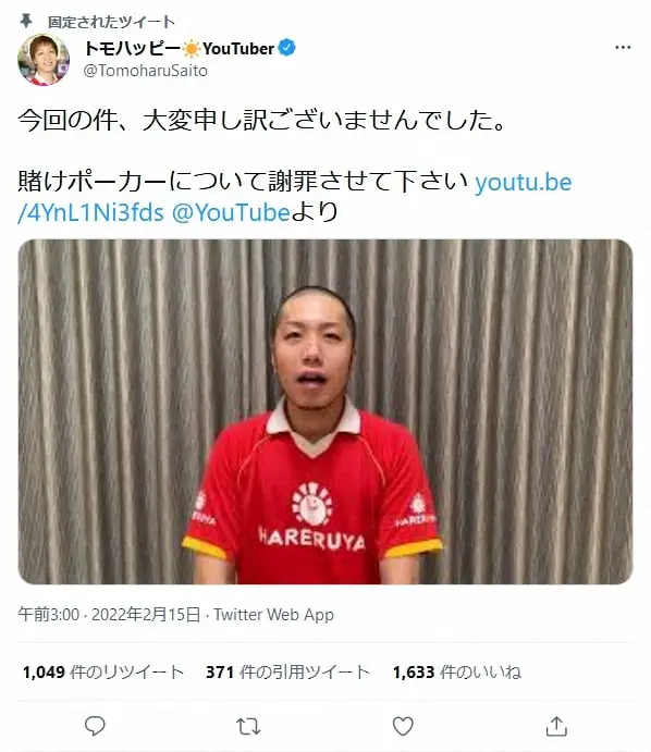 トモハッピー氏は「賭けポーカーについて謝罪させて下さい」というタイトルの動画の中で「みなさま、この度は誠に申し訳ありません。昨年の秋頃から10回以上にわたって、お金を賭けてポーカーを遊んでしまいました。非常に軽率な行動だったと、反省しております」と、事実だと認め謝罪。