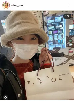 「今年のバレンタインは、グッド!モーニングの『あら、いーな!』で佐々木アナがロケした自動販売機のあるチョコレート専門店のものにしてみました うち一個は焼きたてのスコーンに塗って自分用に…♪ビターで大人味のスプレッドで美味しいです」と記すと、グレーの帽子、黒のコート、オレンジのトップス姿でチョコレートの入った紙袋を手にしたショットをアップ。