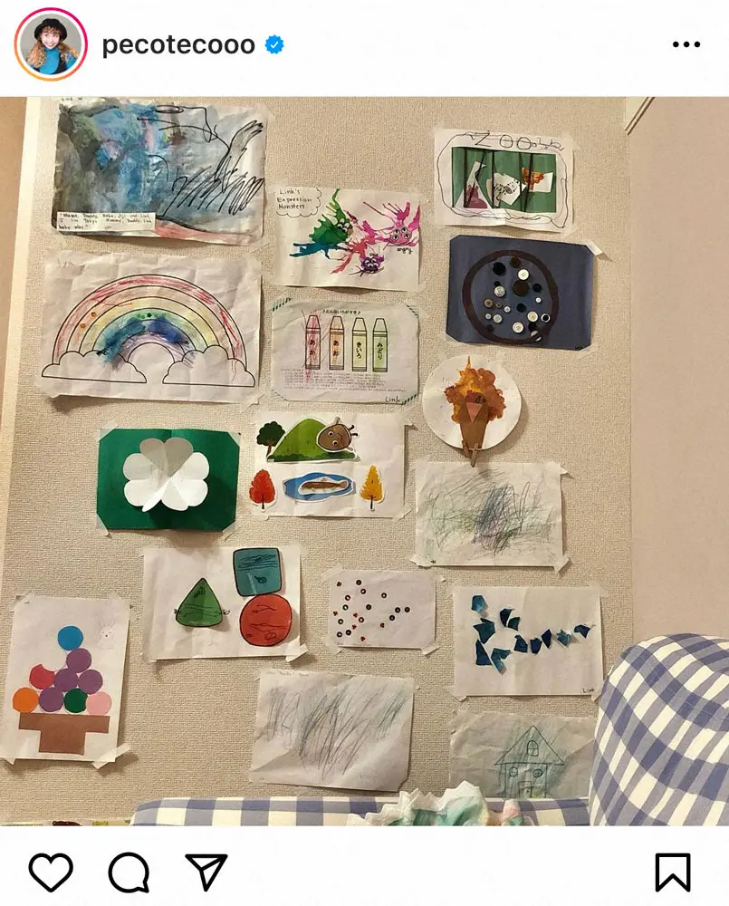 ぺこは17日に「リビングの癒しの場所」と投稿し、子供が描いた絵などを飾ったリビングの壁を写した写真を投稿。これにフォロワーは「カワイイ~が詰まってますね」「子どもの作品って本当に大人にはできないセンスばかりで最高ですよね」「どれも素敵な作品ですね」「この時にしか描けない宝物」といったコメントが寄せられた。