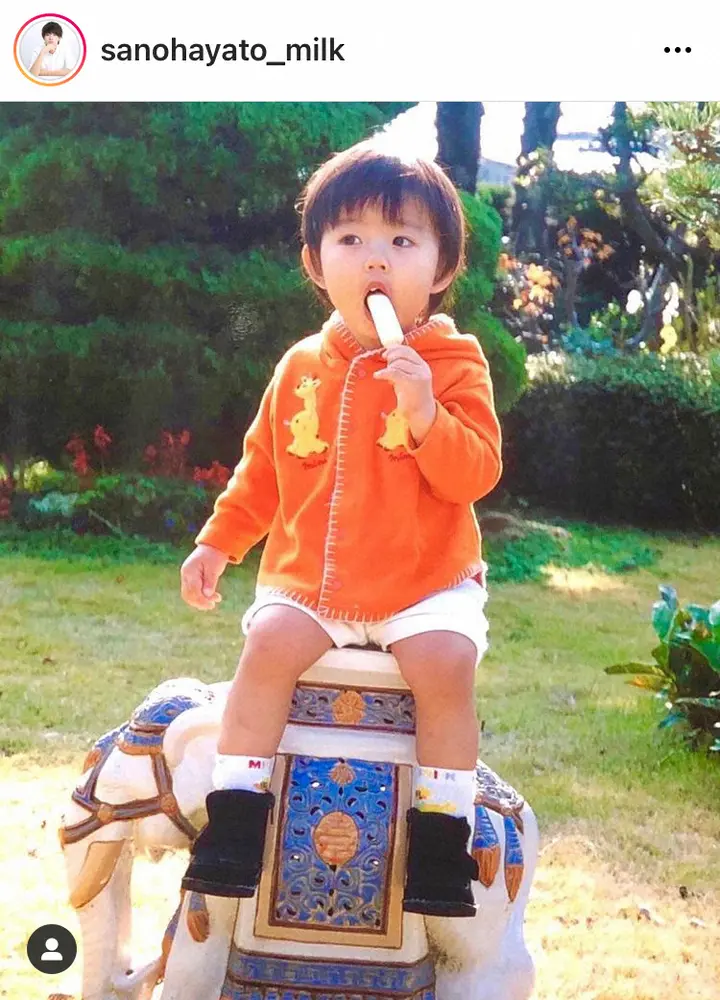 5人組ダンスボーカルグループ「M!LK」のメンバーで、俳優の佐野勇斗(23)が18日、自身のインスタグラム更新。自宅の庭でアイスを食べる1歳の時の写真を投稿し、反響を呼んでいる。