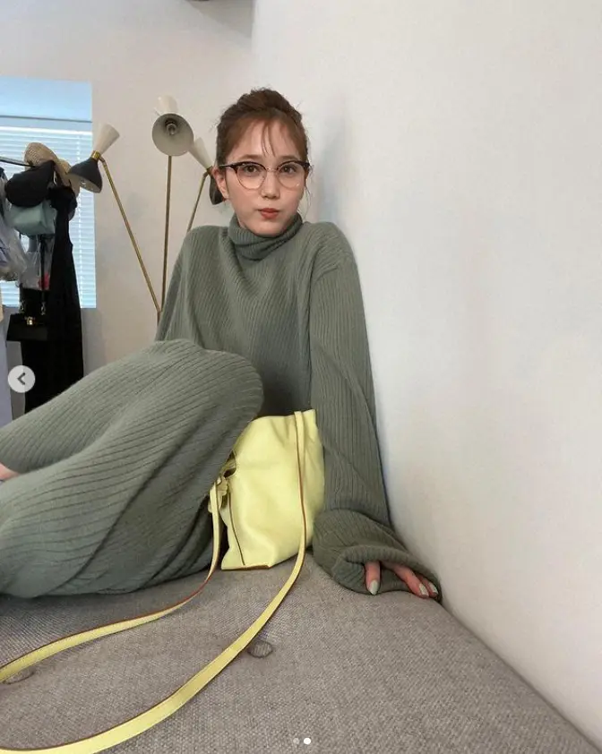 ハッシュタグで「ほんだのふく」と添え、メガネをかけてモスグリーンのニットのセットアップニットを着た写真をアップした。