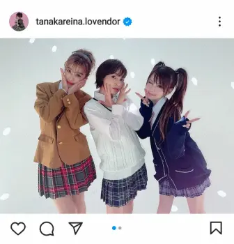 前投稿では元モーニング娘。でタレントの高橋愛、元Berryz工房で歌手の夏焼雅との制服姿での3ショットを投稿。「3人で発売するアルバムの中の1曲『誤爆』のMVが公開されました」「久しぶりの制服にツインテールで女子高生になりきってます」などと記していた。