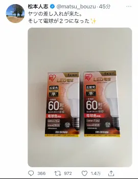 コロナ感染の松本人志「ヤツの差し入れが来た」電球2個並べ…フォロワーは「中居くんですね」「キター」