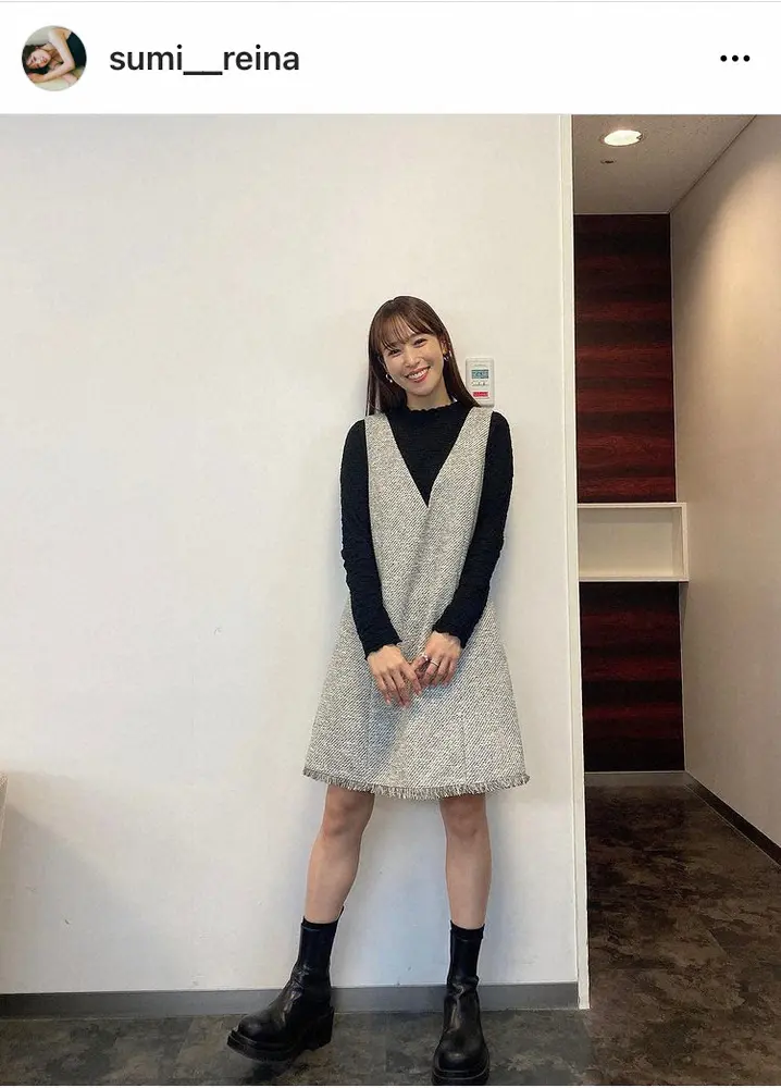 「久しぶりに私服」と記して3枚をアップ。「最近ワイドパンツばっかり履いてるなーと思って買った@mystrada_officialのツイード素材のジャンスカ。デザインが綺麗めなので、あえて大きめのMサイズを選んでストンとしたカジュアルなシルエットで着ています」とグレーの膝上丈のジャンパースカートに黒のブーツを合わせたコーデを披露した。
