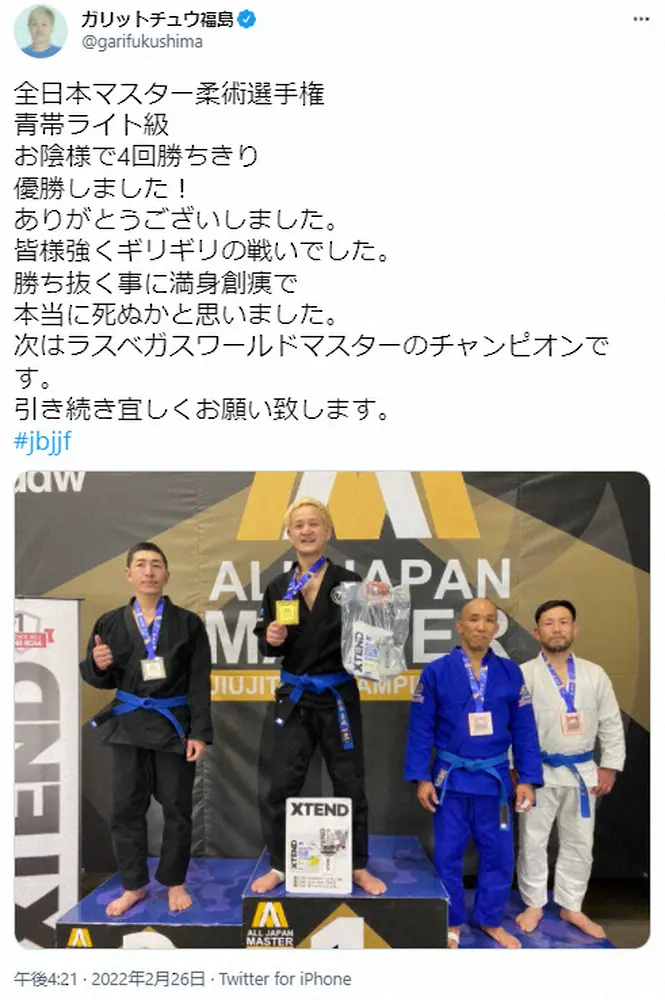 フワちゃんのコスプレを披露した「ガリットチュウ」の福島善成。公式インスタグラム(@fukushimayoshinari)より ガリチュウ福島 全日本マスター柔術選手権で優勝「本当に死ぬかと」 27… ギャラリーで見る この記事のフォト 2022年02月26日の画像一覧 もっと見る 2022年02月26日の画像をもっと見る