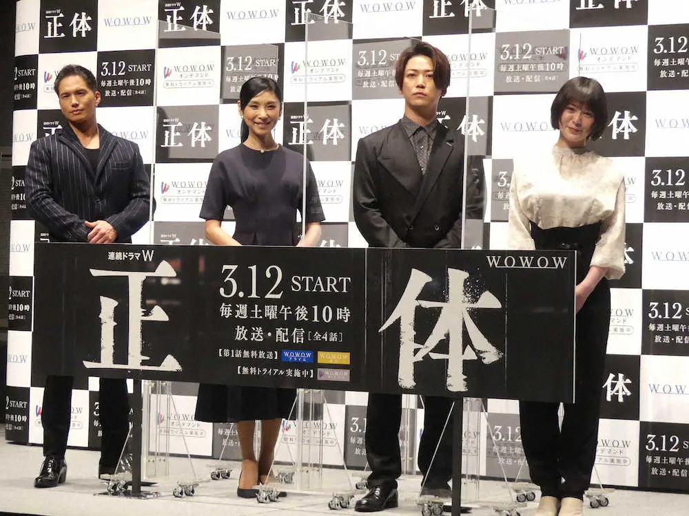 WOWOW「連続ドラマW 正体」の完成報告会見に出席した(左から)市原隼人、黒木瞳、亀梨和也、貫地谷しほり