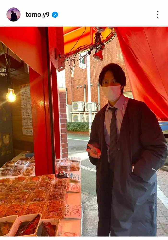 「撮影現場の近くにお惣菜屋さん発見」と記すと、シャツにネクタイ、マスクにコート姿で焼きそばなどの総菜が並ぶ店頭でピースサインをするショットをアップ。、商品を指さして「お邪魔します」と言う軽妙な動画も投稿し、「この昔ながらのホームメイド感最高に美味しかった。ドラマ撮影中の一つの楽しみです。今日も頑張ります!」とつづった。