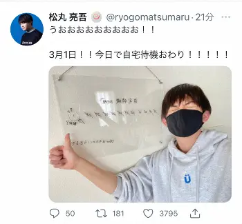 コロナ感染の松丸亮吾 「今日で自宅待機おわり!」自宅療養期間終了を報告 1カ月で2度の陽性判定