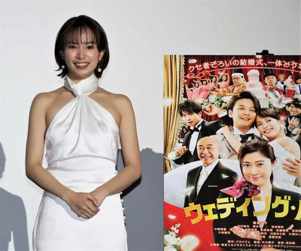 あるカップルの披露宴とその裏で繰り広げられるドタバタを描く同作で、新婦役を演じた関水。この日も、役柄とリンクした純白のサテンシルクドレスで登場し、「上品な露出です」と笑顔でアピールした。