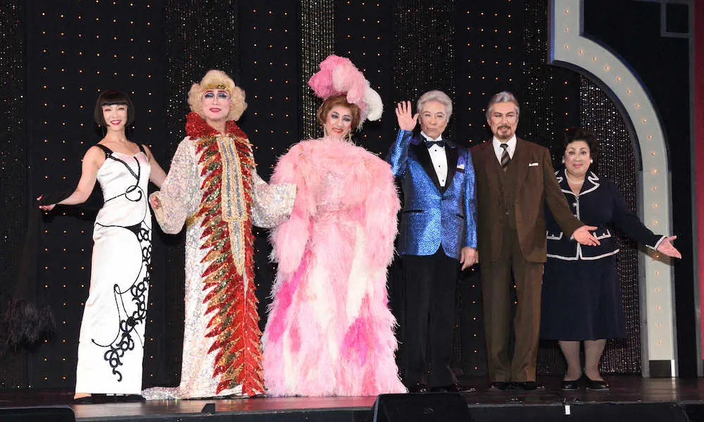 ミュージカル「ラ・カージュ・オ・フォール」に出演する(左から)香寿たつき、真島茂樹、市村正親、鹿賀丈史、今井清隆、森公美子