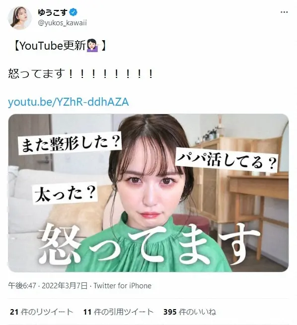 「SNSでよく言われている悪口や誤解を解く」という企画で、「パパ活してるってマジ?」という疑惑に言及。これに、ゆうこすは「結果から言うとしてません。そりゃそうだよ、チャンネル登録者が85万人とかいて。ある程度お金も稼いでるから、パパ活はしません」とキッパリ否定した。