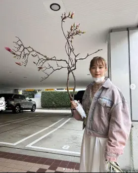 「枝もらったよー 花咲くらしいよー」とつづり、淡いピンク色がかったジャケットに白のオーバーパンツ姿で、複数の蕾がつけたモクレンとみられる木の枝を持っている写真をアップした。